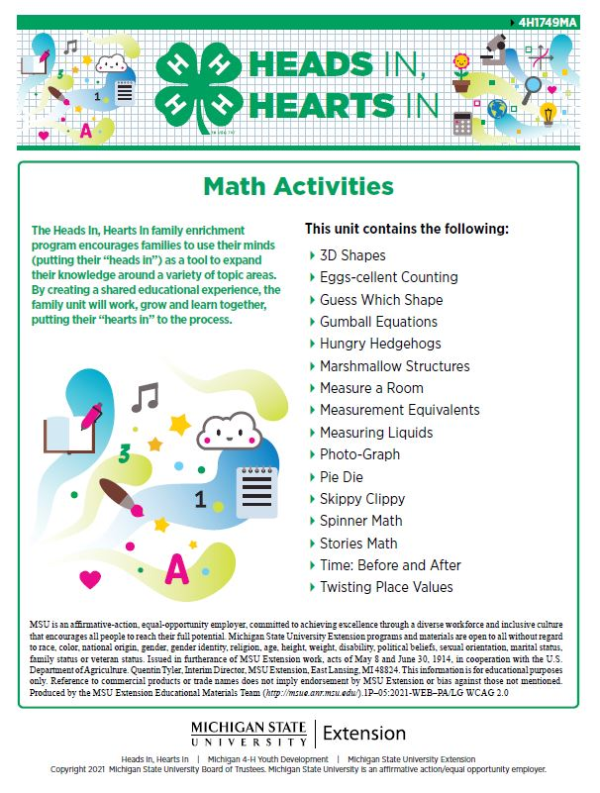 Heads In, Hearts In: Math Activities are designed to help Michigan State University Extension staff members to involve partners in facilitating a family enrichment program around the topic of math. This packet contains all 16 mindfulness activities.