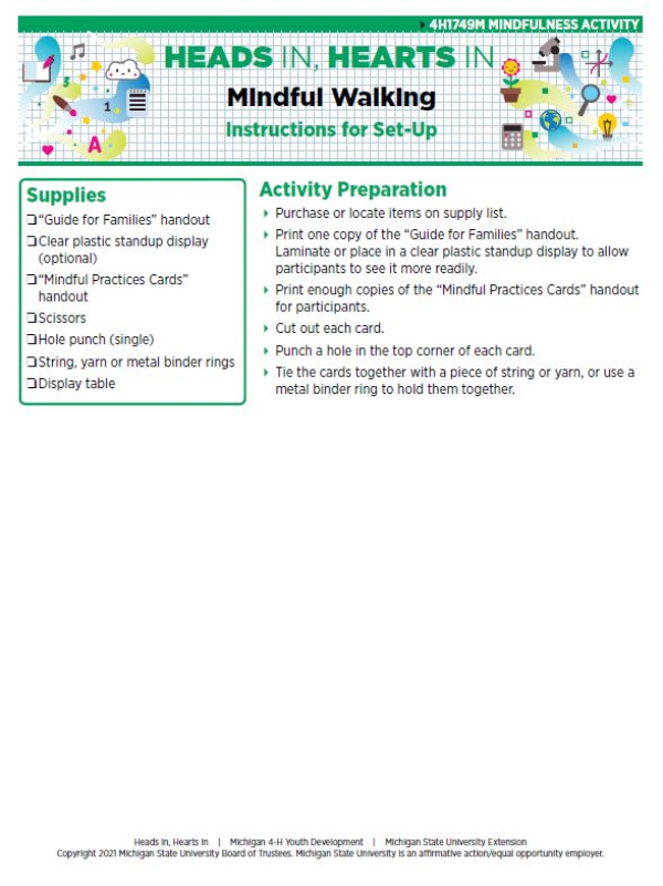 In this activity, you will take a walk and practice slowing down and trying mindful noticing. The goal is not to complete the activity quickly or to notice the most things. Instead, the goal is to slow down, breathe deeply and focus your energy on the present moment.