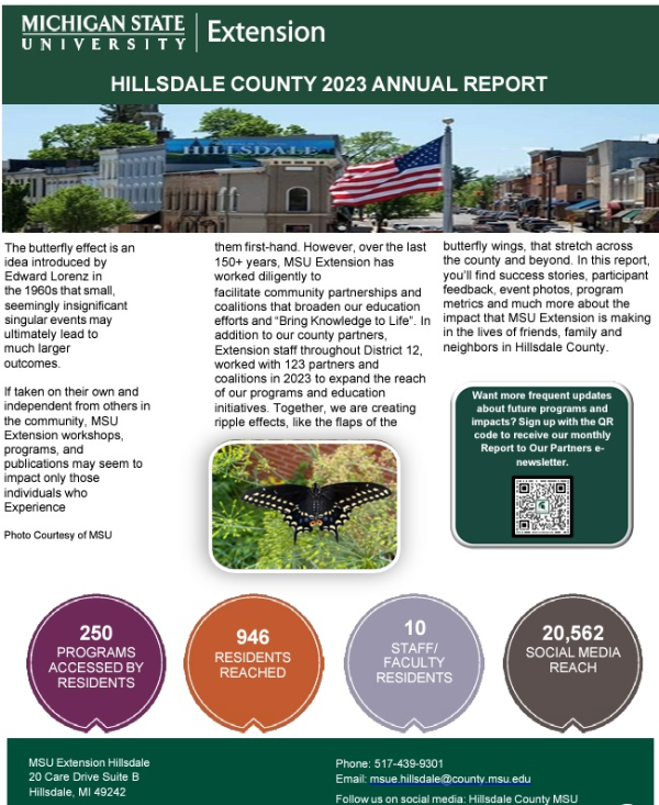 The butterfly effect is an idea introduced by Edward Lorenz in the 1960s that small, seemingly insignificant singular events may ultimately lead to much larger outcomes. If taken on their own and independent from others in the community, MSU Extension workshops, programs, and publications may seem to impact only those individuals who experience them first-hand. However, for over 150 years, Extension has worked diligently to facilitate community partnerships and coalitions that broaden our education efforts and “Bring Knowledge to Life.” In addition to our county partners, Extension staff throughout District 12 worked with 123 partners and coalitions in 2023 to expand the reach of our programs and education initiatives. Together, we are creating ripple effects, like the flaps of the butterfly wings, that stretch across the county and beyond. In the 2023 annual report, you’ll find success stories, participant feedback, event photos, program metrics, and much more about the impact that Extension is making in the lives of friends, family, and neighbors in Hillsdale County.