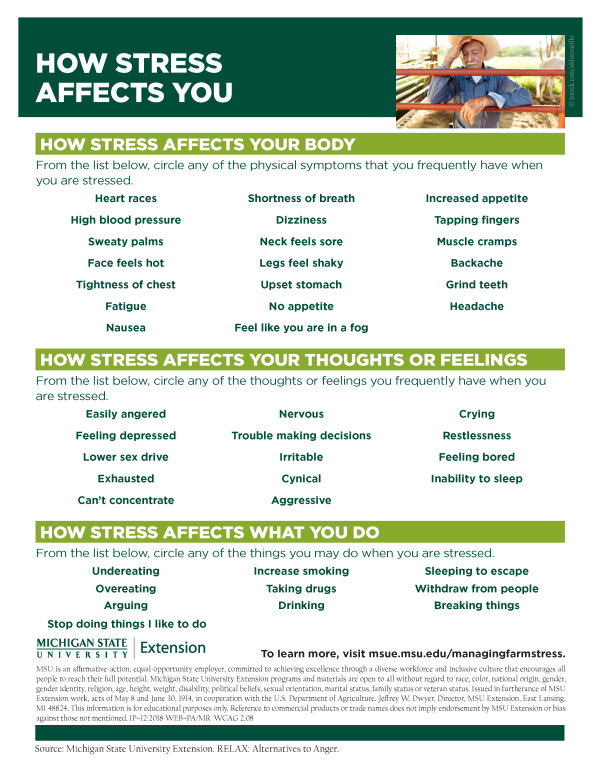 This activity sheet has a list of items detailing various impacts from stress. You can circle the items that apply to you in each section to better understand how stress is affecting you. This resource comes from the MSU Extension program RELAX: Alternatives to Anger.