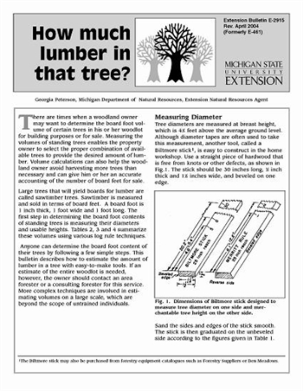Anyone can determine the board foot content of their trees by following a few simple steps. This bulletin describes how to estimate the amount of lumber in a tree with easy-to-make tools. If an estimate of the entire woodlot is needed, however, the owner should contact an area forester or a consulting forester for this service. More complex techniques are involved in estimating volumes on a large scale, which are beyond the scope of untrained individuals.