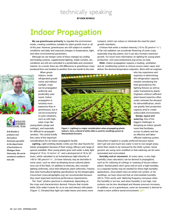 High-value crops can be propagated indoors, inside refrigerated growth rooms and without sunlight. This article briefly lists some of the important considerations for an indoor propagation facility.