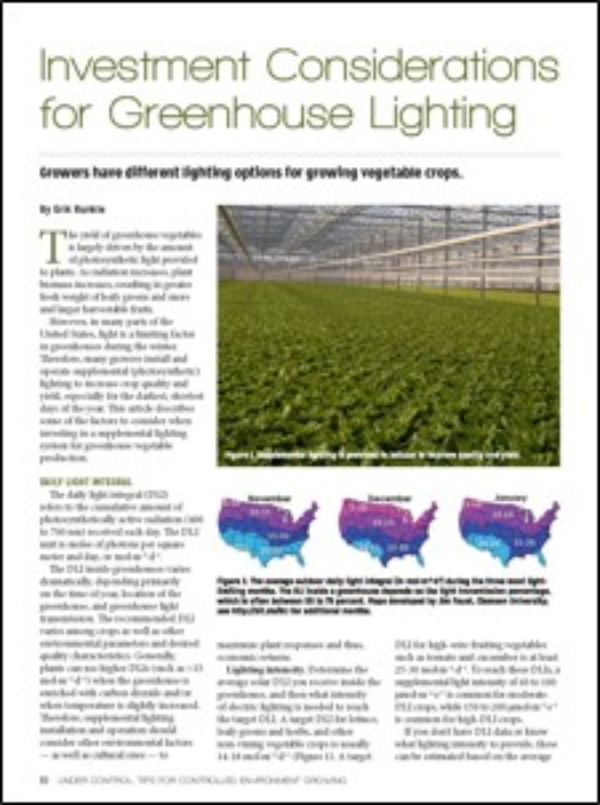 Many growers install and operate supplemental (photosynthetic) lighting to increase crop quality and yield. This article describes some of the factors to consider when investing in a supplemental lighting system for greenhouse crop production.