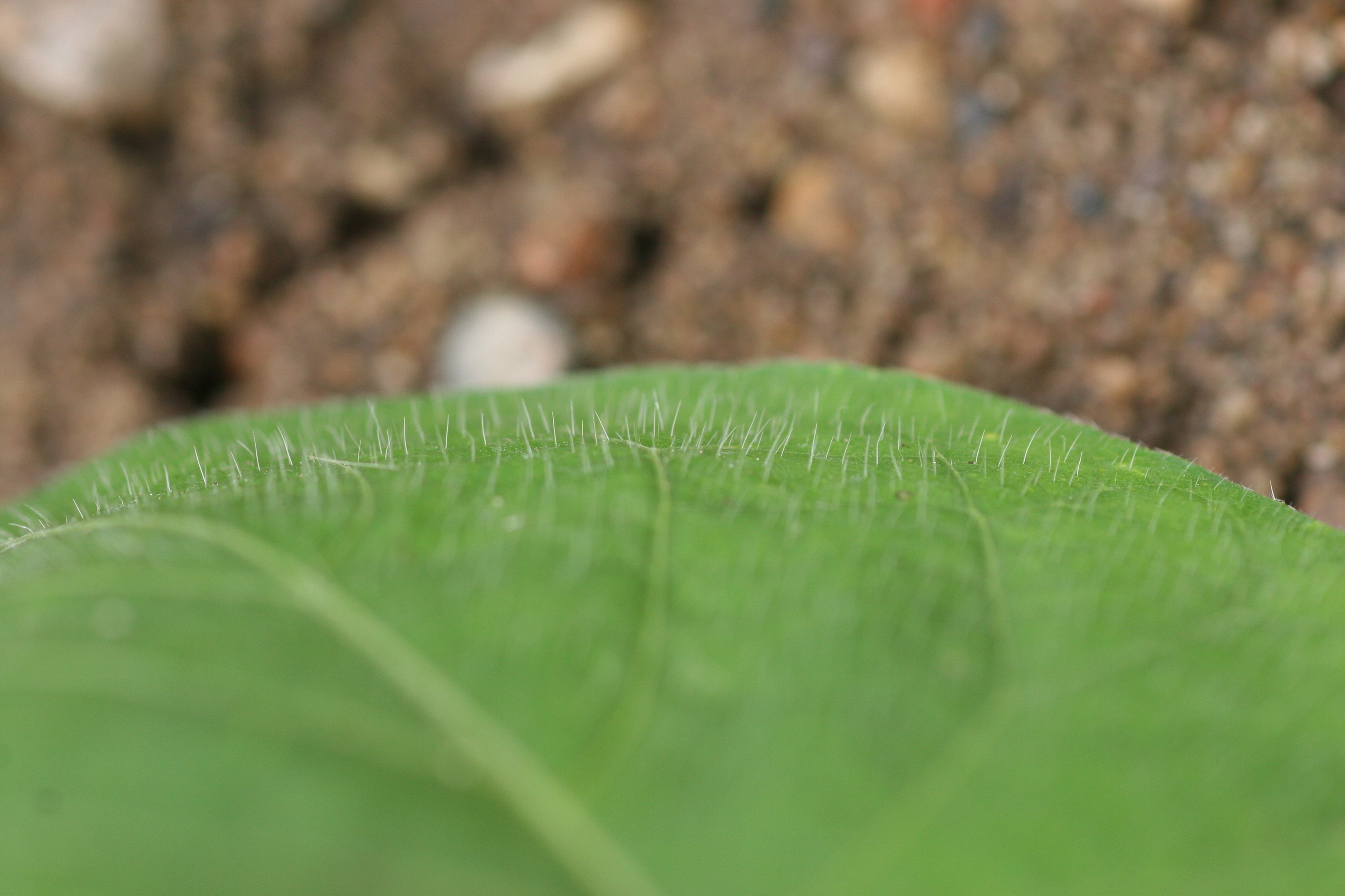 Differs by having V-shaped cotyledons and heart-shaped leaves with no to few hairs.