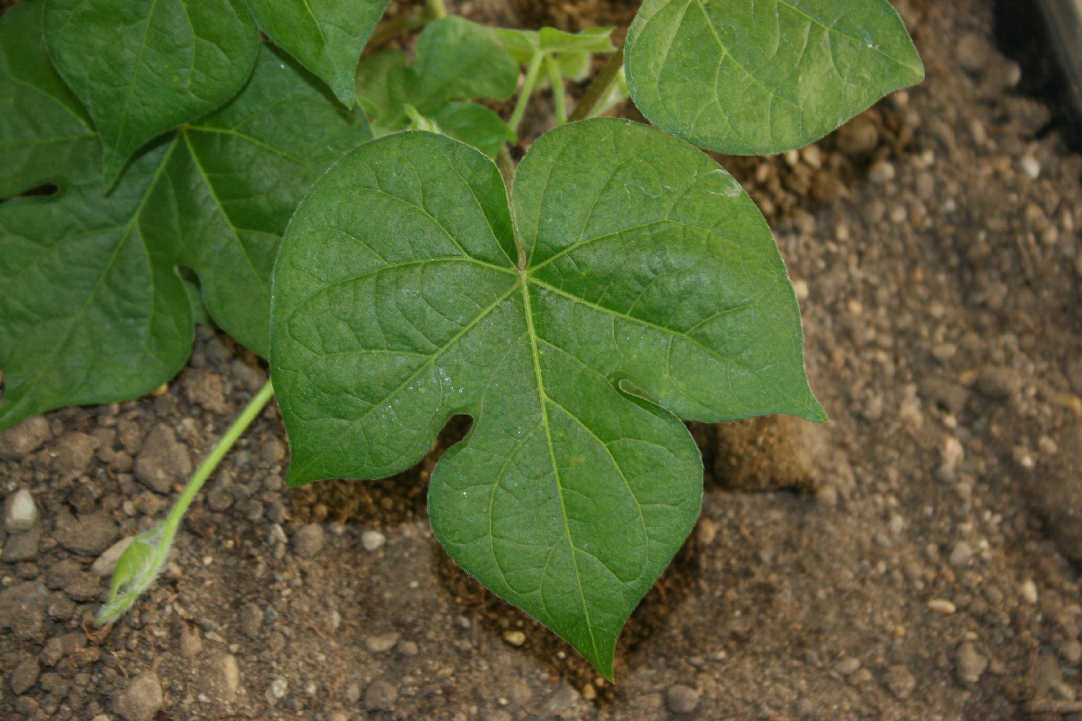 Cotyledons are butterfly-shaped and usually narrower at the base. Leaves are alternate with erect hairs on both surfaces. The first leaf may be unlobed; all other leaves are three-lobed and ivy-shaped.