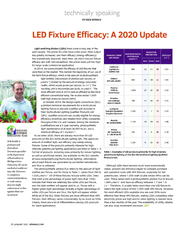 As we enter 2020, there are already more than 50 LED products on the Design Light Consortium's Horticultural Lighting list of qualified products. The spectrum, amount of emitted light, and efficacy vary widely among fixtures.