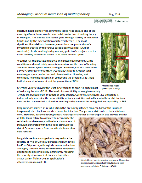 Fusarium head blight (FHB), commonly called head scab, is one of the most significant threats to the successful production of malting barley in Michigan. The disease can reduce yield through sterility of individual florets and by the deterioration of infected kernels. The most significant financial loss, however, stems from the production of a mycotoxin created by the fungus called deoxynivalenol (DON or vomitoxin). In the malting barley market, grain is often rejected or its value severely discounted where DON levels exceed 1 ppm.
