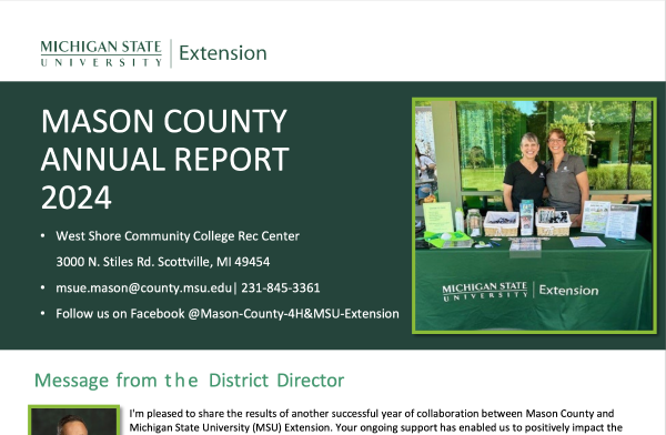 I'm pleased to share the results of another successful year of collaboration between Mason County and Michigan State University (MSU) Extension. Your ongoing support has enabled us to positively impact the lives of youth, families, businesses, and communities. MSU Extension offers a diverse array of research- based educational services to county residents. Over the past year, we've helped families and individuals adopt healthier lifestyles, supported new and local businesses, provided opportunities for youth leadership development and career exploration, assisted farmers with business management and mental health, and much more.