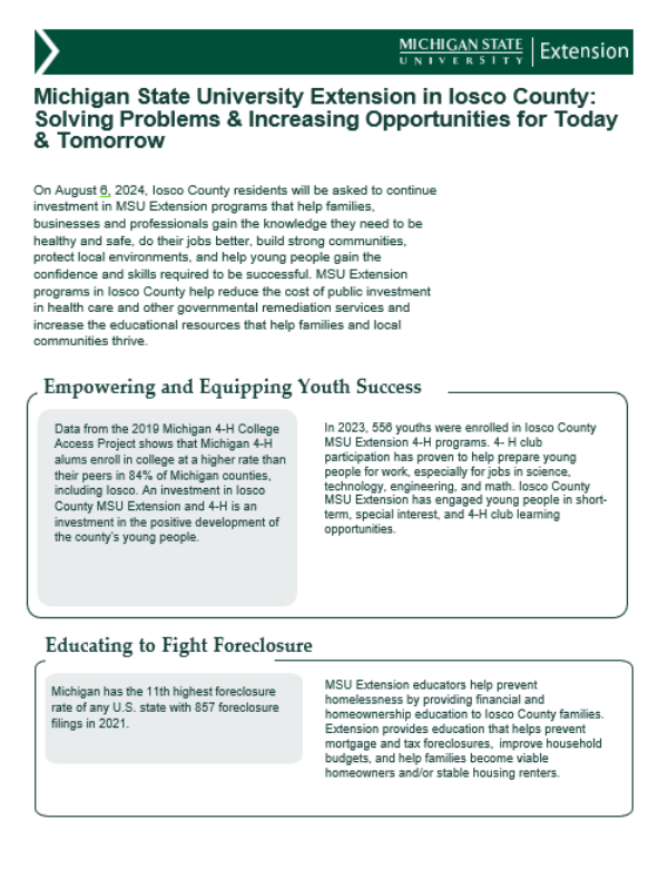 On August 6, 2024, Iosco County residents will be asked to continue investment in MSU Extension programs that help families, businesses and professionals gain the knowledge they need to be healthy and safe, do their jobs better, build strong communities, protect local environments, and help young people gain the confidence and skills required to be successful. MSU Extension programs in Iosco County help reduce the cost of public investment in health care and other governmental remediation services and increase the educational resources that help families and local communities thrive.