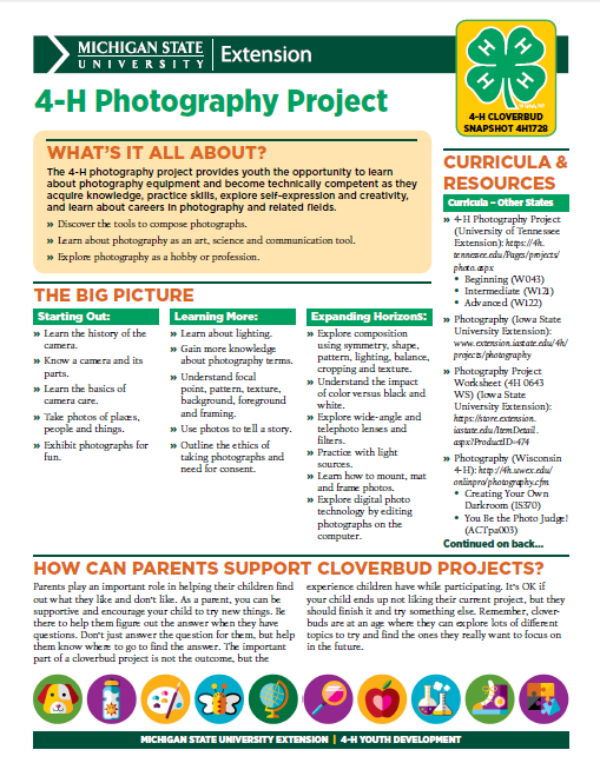 Michigan 4-H Cloverbud Snapshot Sheet: 4-H Photography Project (4H1728)