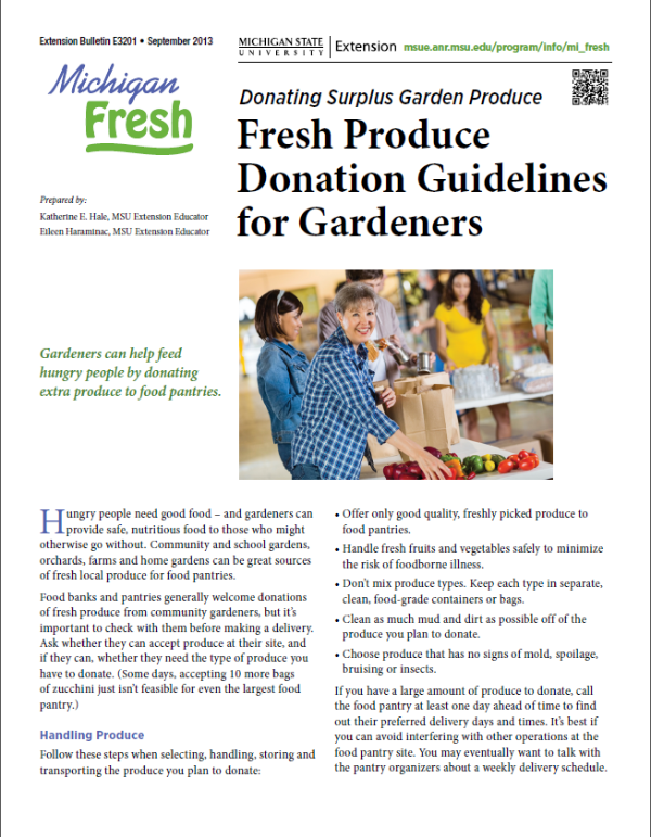 Your produce donation to a local food pantry will help everyone meet the U.S. Department of Agriculture recommendation (see www.choosemyplate.gov) that Americans eat more fruits and vegetables. Michigan Fresh (msue.anr.msu.edu/program/info/mi_fresh), which is part of MSU Extension, has information on recommended varieties, storage, food safety and preserving techniques for fruits and vegetables.