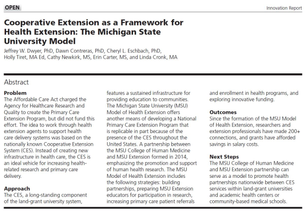 Four strategies of the MSU Model of Health Extension were recently published in Academic Medicine, the official journal of the Association of American Medical Colleges. The MSU Model of Health Extension is a blueprint that can be adopted by Cooperative Extension throughout the United States to establish a nationwide health extension framework.
