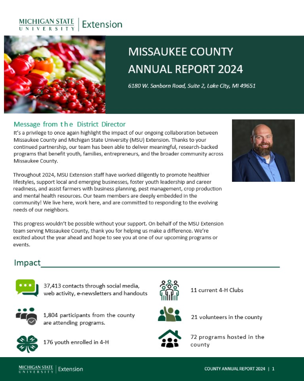 It’s a privilege to once again highlight the impact of our ongoing collaboration between Missaukee County and Michigan State University (MSU) Extension. Thanks to your continued partnership, our team has been able to deliver meaningful, research-backed programs that benefit youth, families, entrepreneurs, and the broader community across Missaukee County.