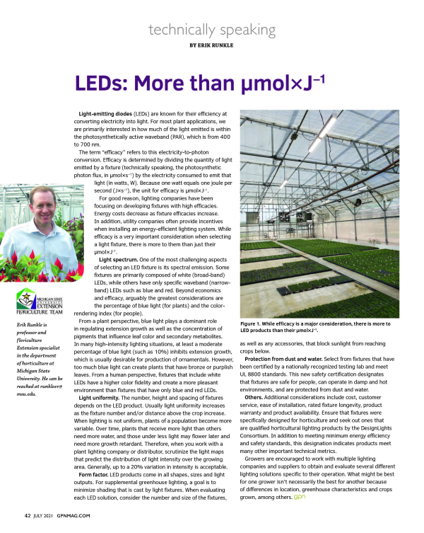Light-emitting diodes (LEDs) are known for their efficiency at converting electricity into light. While efficacy is a very important consideration, there is more to them than just their μmol×J–1.