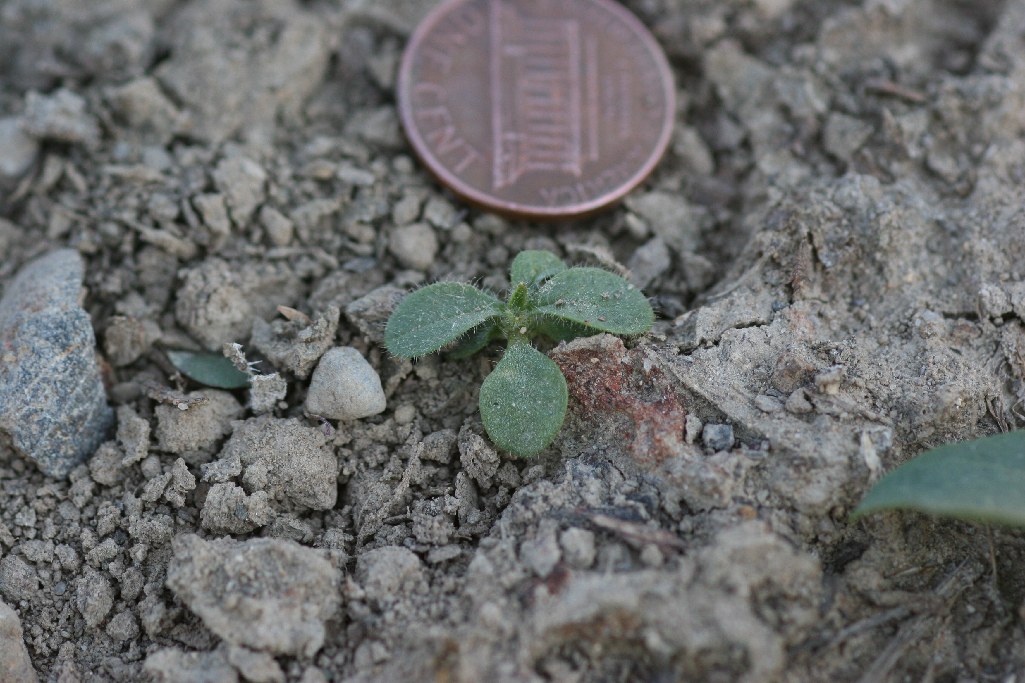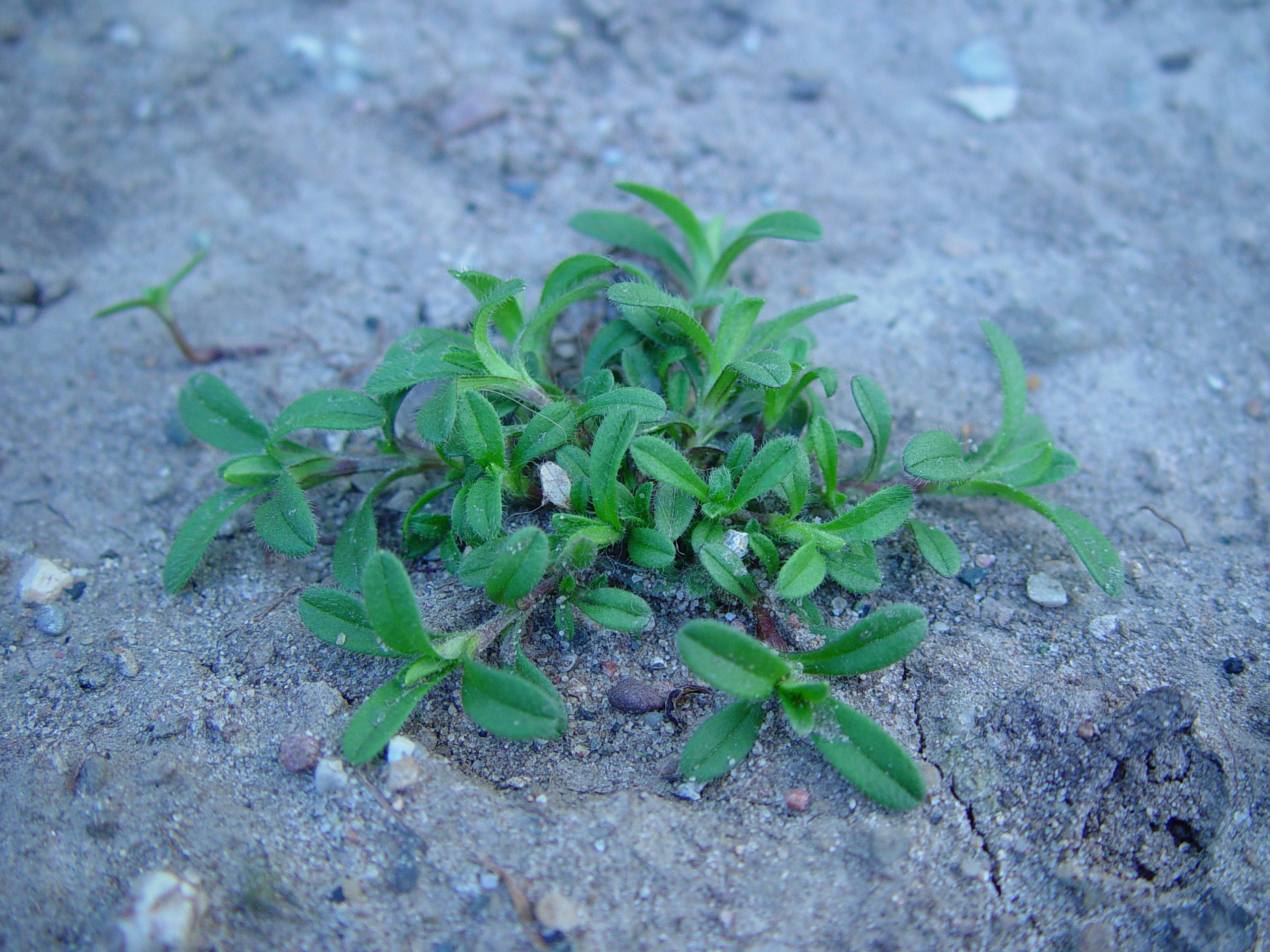 Prostrate, spreading stems are capable of rooting at the nodes to form dense patches. Stems are slender and very finely hairy with swollen nodes.