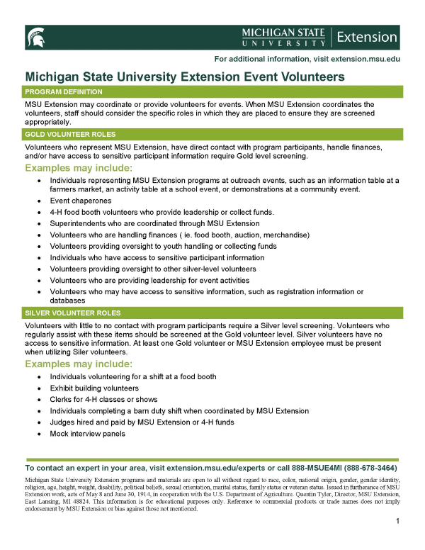 MSU Extension may coordinate or provide volunteers for events. When MSU Extension coordinates the volunteers, staff should consider the specific roles in which they are placed to ensure they are screened appropriately.