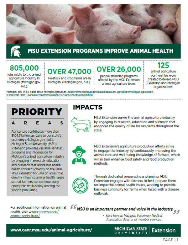 Agriculture contributes more than $104.7 billion annually to our state’s economy (Michigan.gov., n.d.). Michigan State University (MSU) Extension provides valuable services, programs and information for Michigan’s animal agriculture industry by engaging in research, education and outreach that addresses animal health concerns directly on the farm. MSU Extension focuses on areas that directly influence animal health issues so that farmers can continue daily operations while safely feeding the world’s population.