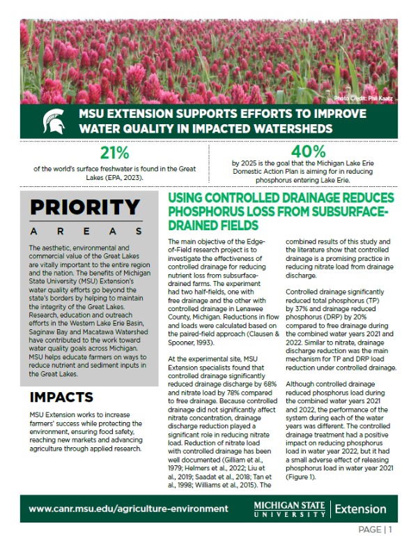 The aesthetic, environmental and commercial value of the Great Lakes are vitally important to the entire region and the nation. The benefits of Michigan State University (MSU) Extension’s water quality efforts go beyond the state’s borders by helping to maintain the integrity of the Great Lakes. Research, education and outreach efforts in the Western Lake Erie Basin, Saginaw Bay and Macatawa Watershed have contributed to the work toward water quality goals across Michigan. MSU helps educate farmers on ways to reduce nutrient and sediment inputs in the Great Lakes.
