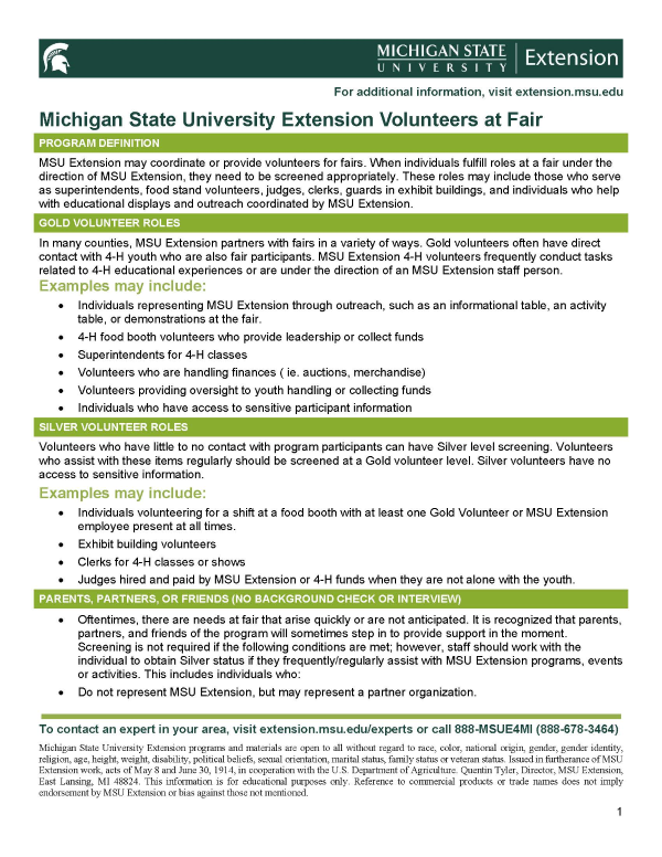MSU Extension may coordinate or provide volunteers for fairs. When individuals fulfill roles at a fair under the direction of MSU Extension, they need to be screened appropriately. These roles may include those who serve as superintendents, food stand volunteers, judges, clerks, guards in exhibit buildings, and individuals who help with educational displays and outreach coordinated by MSU Extension.