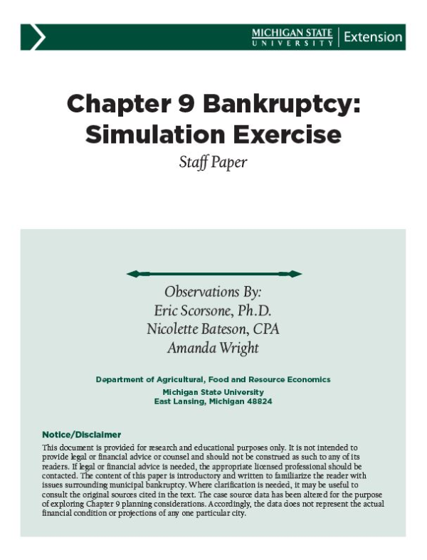 Cities facing a financial emergency from chronic fiscal stress need to understand Chapter 9 municipal bankruptcy. While not a cure for fiscal stress, Chapter 9 is a tool that a municipality may use to reset its financial course when all other methods fail. Several lessons learned through a simulation exercise using live case data prove beneficial to those charged with municipal fiscal health. From a legal perspective, the exercise revealed a need to address common misconceptions about Chapter 9. From a financial perspective, strategically planning to avoid a bankruptcy increases transparency while working through a checklist of alternatives. If those alternatives fail, the city is in a reasoned position to seek Chapter 9 relief.