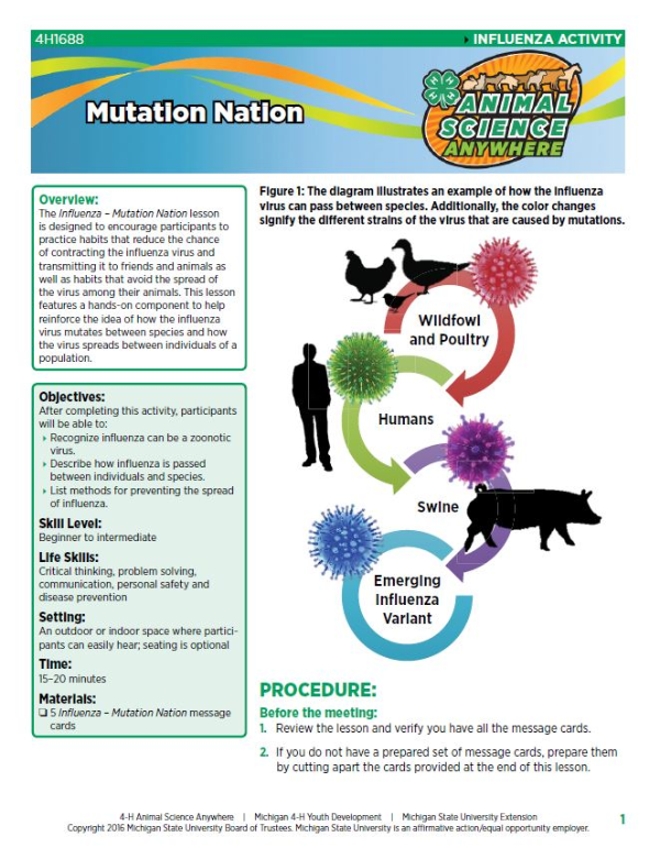 The Influenza – Mutation Nation lesson is designed to encourage participants to practice habits that reduce the chance of contracting the influenza virus and transmitting it to friends and animals as well as habits that avoid the spread of the virus among their animals. This lesson features a hands-on component to help reinforce the idea of how the influenza virus mutates between species and how the virus spreads between individuals of a population.