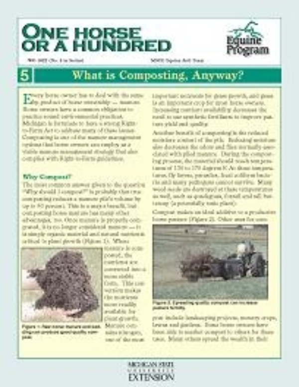 Every horse owner has to deal with the same by-product of horse ownership — manure. Horse owners have a common obligation to practice sound environmental practices. Michigan is fortunate to have a strong Right-to-Farm Act to address many of these issues. Composting is one of the manure management options that horse owners can employ as a viable manure management strategy that also complies with Right-to-Farm guidelines.