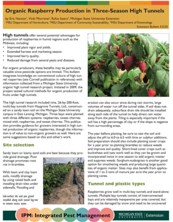 This bulletin integrates MSU organic research experience with existing knowledge on high tunnel raspberry culture as described in Cornell University’s High Tunnel Raspberries and Blackberries publication: www.fruit.cornell.edu/ berry/production/pdfs/hightunnelsrasp2012.pdf