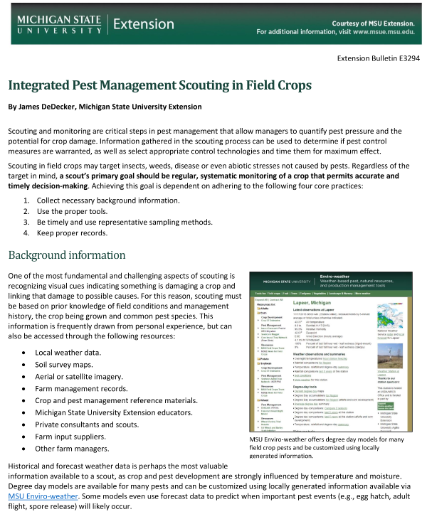 Historical and forecast weather data is perhaps the most valuable information available to a scout, as crop and pest development are strongly influenced by temperature and moisture. Degree day models are available for many pests and can be customized using locally generated information available via MSU Enviro-weather. Some models even use forecast data to predict when important pest events (e.g., egg hatch, adult flight, spore release) will likely occur.