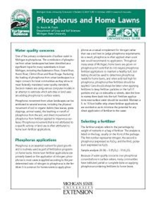 Phosphorus is an essential nutrient for plant growth and is routinely used as part of fertilization programs on home lawns. Home lawn fertilizer applications are primarily based on the application of nitrogen; phosphorus in most cases is applied according to the predetermined ratio of nitrogen to phosphorus in the fertilizer. It is common for homeowners to apply phos phorus as a casual complement for nitrogen rather than use a soil test to judge phosphorus requirements. As a result, phosphorus is often applied when a soil test would recommend no application. Throughout many areas of Michigan, home lawns are grown on phosphorus-rich soils that do not require phosphorus fertilizer applications to maintain a healthy turf. Soil testing should be used to determine phosphorus needs for home lawns, and when soils test high for phosphorus, phosphorus-free fertilizers should be applied. Care should always be taken when applying fertilizers to keep fertilizer particles on the turf. If particles end up on sidewalks or streets, take the time to sweep them back into the turf. Fertilizer applications near surface water should be avoided. Maintain a 5- to 10-foot buffer strip where fertilizer applications are avoided so as to minimize the potential for any direct application of fertilizer to the water.