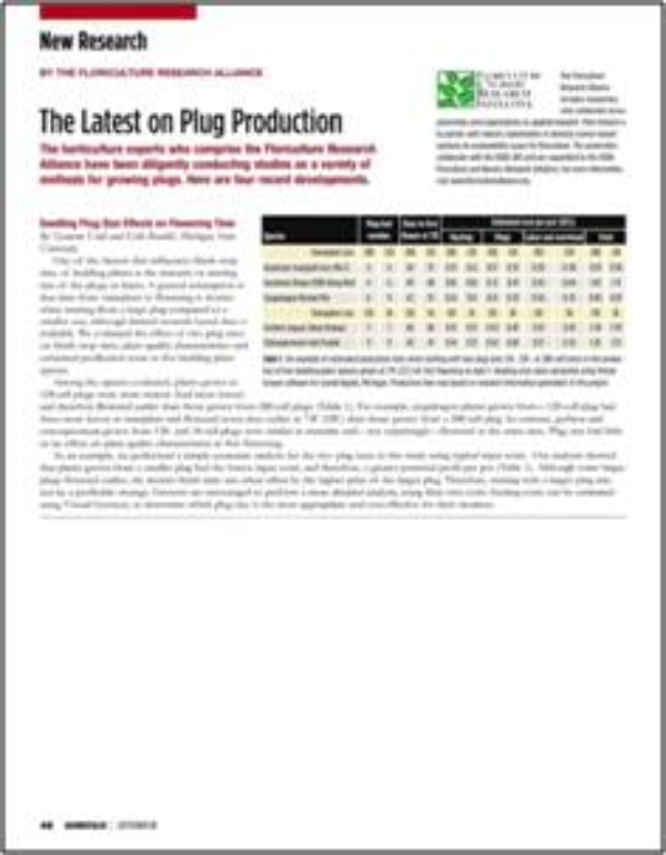 We evaluated the effect of two plug sizes on finish crop time, plant quality characteristics, and estimated production costs for five bedding plant species.