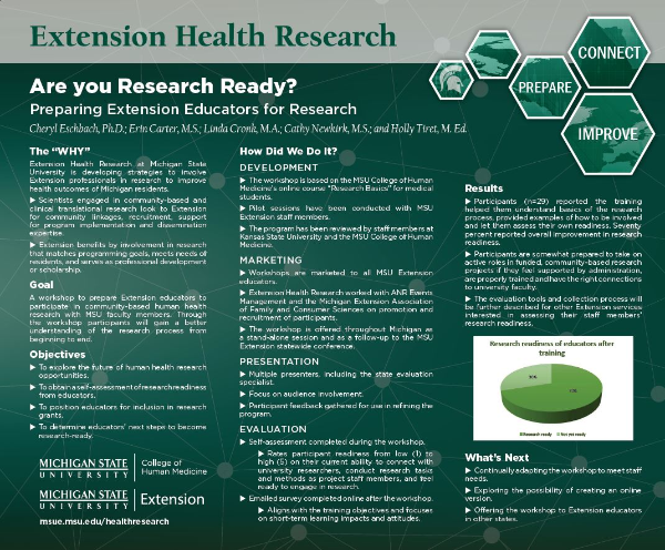 Poster presentation from the 2016 National Extension Association Family and Consumer Sciences annual meeting in Big Sky, Montana. This training prepares Extension educators to engage in the translation of research to community-based education. “Are You Research Ready?” is a workshop covering topics such as steps of the research process, responsible conduct of research, and how to communicate with researchers for grant project inclusion. The “Are You Research Ready” workshop is prime for multi-state Extension efforts that wish to build faculty and staff competencies in applied research and program evaluation. Other Extension systems in different states may be interested in adopting the training materials.