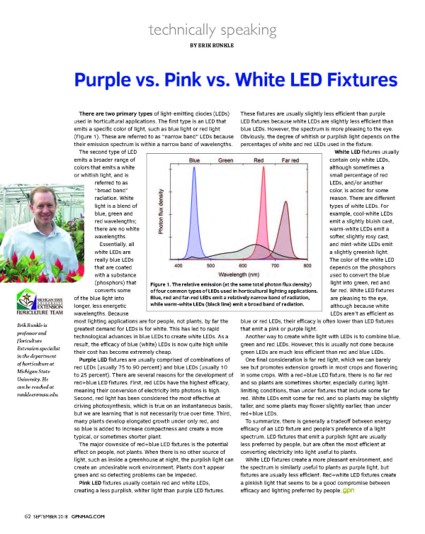 LED fixtures that emit a purplish light are usually less preferred by people, but are often the most efficient at converting electricity into light useful to plants.