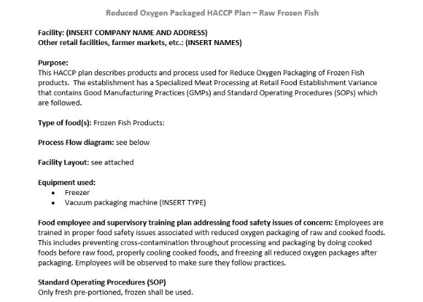 This HACCP plan describes products and process used for Reduce Oxygen Packaging of Frozen Fish products. The establishment has a Specialized Meat Processing at Retail Food Establishment Variance that contains Good Manufacturing Practices (GMPs) and Standard Operating Procedures (SOPs) which are followed.