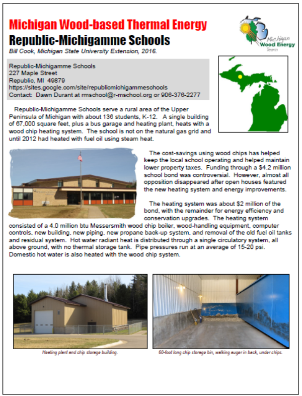 The Republic-Michigamme Schools burned fuel oil prior to 2012. The savings obtained by the conversion to wood chips has been well-accepted in the communities and the school loves it.