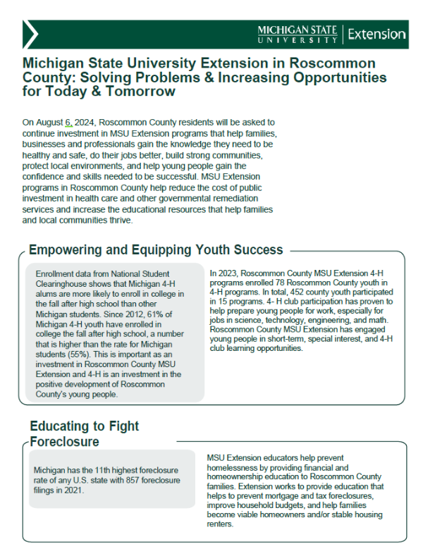 On August 6, 2024, Roscommon County residents will be asked to continue investment in MSU Extension programs that help families, businesses and professionals gain the knowledge they need to be healthy and safe, do their jobs better, build strong communities, protect local environments, and help young people gain the confidence and skills needed to be successful. MSU Extension programs in Roscommon County help reduce the cost of public investment in health care and other governmental remediation services and increase the educational resources that help families and local communities thrive.