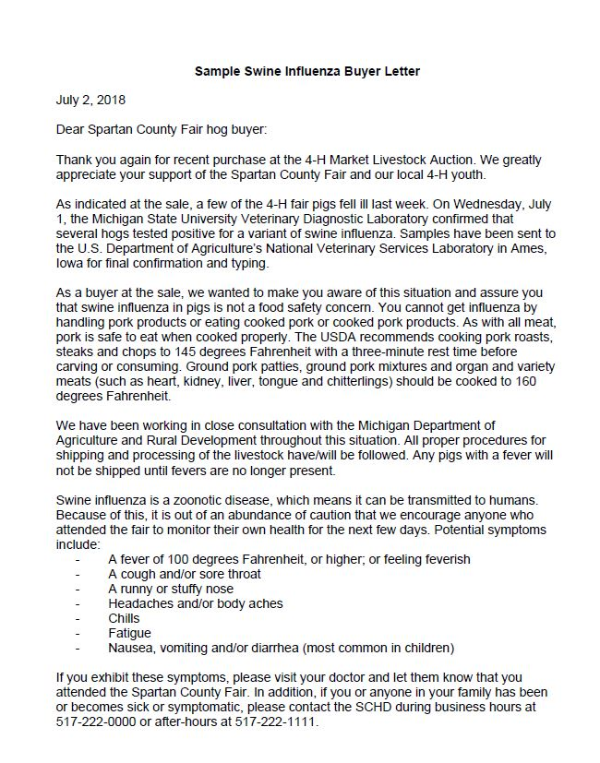 This sample letter can be used by fairs or exhibitions who had hogs test positive for swine influenza as a means of updating hog buyers about the situation, importance of biosecurity and the human symptoms of which to be aware.