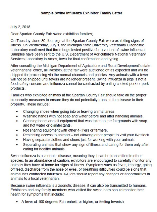 This sample letter can be used by fairs or exhibitions who had hogs test positive for swine influenza as a means of updating exhibitors and their families about the situation, importance of biosecurity and the human symptoms of which to be aware.
