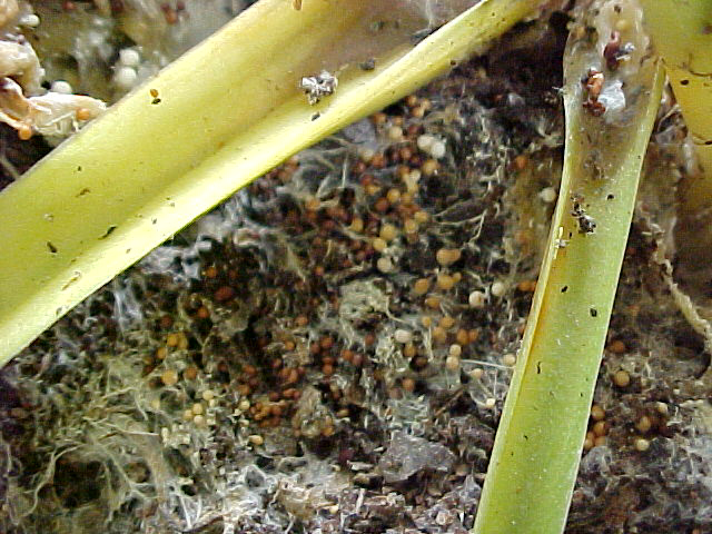 Spread: This is a soil borne pathogen, movement of soil or diseased plant material spreads the disease. The pathogen can persist for extended periods of time in soil as sclerotia. During hot, humid conditions sclerotia germinate producing fungal mats that can infect susceptible hosts. Sclerotium rolfsii rarely produces spores, so dispersal by air movement is not significant.
