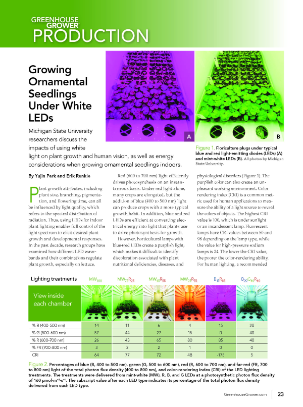 Michigan State University researchers discuss the impacts of using white light on plant growth and human vision, as well as energy considerations when growing ornamental seedlings indoors.