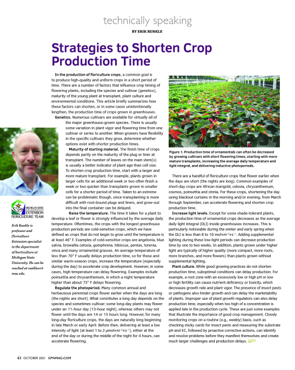 This article briefly summarizes how genetics, transplant size, and cultural and environmental conditions can shorten, or in some cases unintentionally lengthen, the production time of crops grown in greenhouses.
