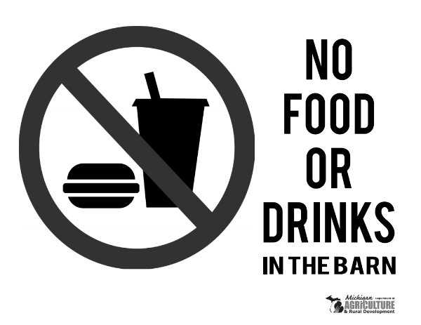 Remember to use good biosecurity practices when caring for animals.This sign lets people know to keep food and drinks out of the barn.