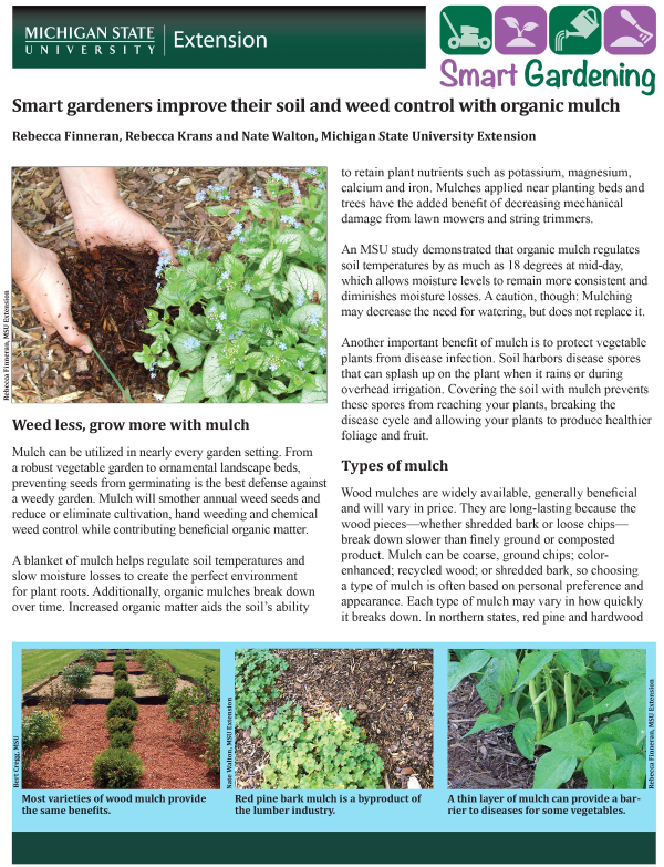 An MSU study demonstrated that organic mulch regulates soil temperatures by as much as 18 degrees at mid-day, which allows moisture levels to remain more consistent and diminishes moisture losses. A caution, though: Mulching may decrease the need for watering, but does not replace it.
