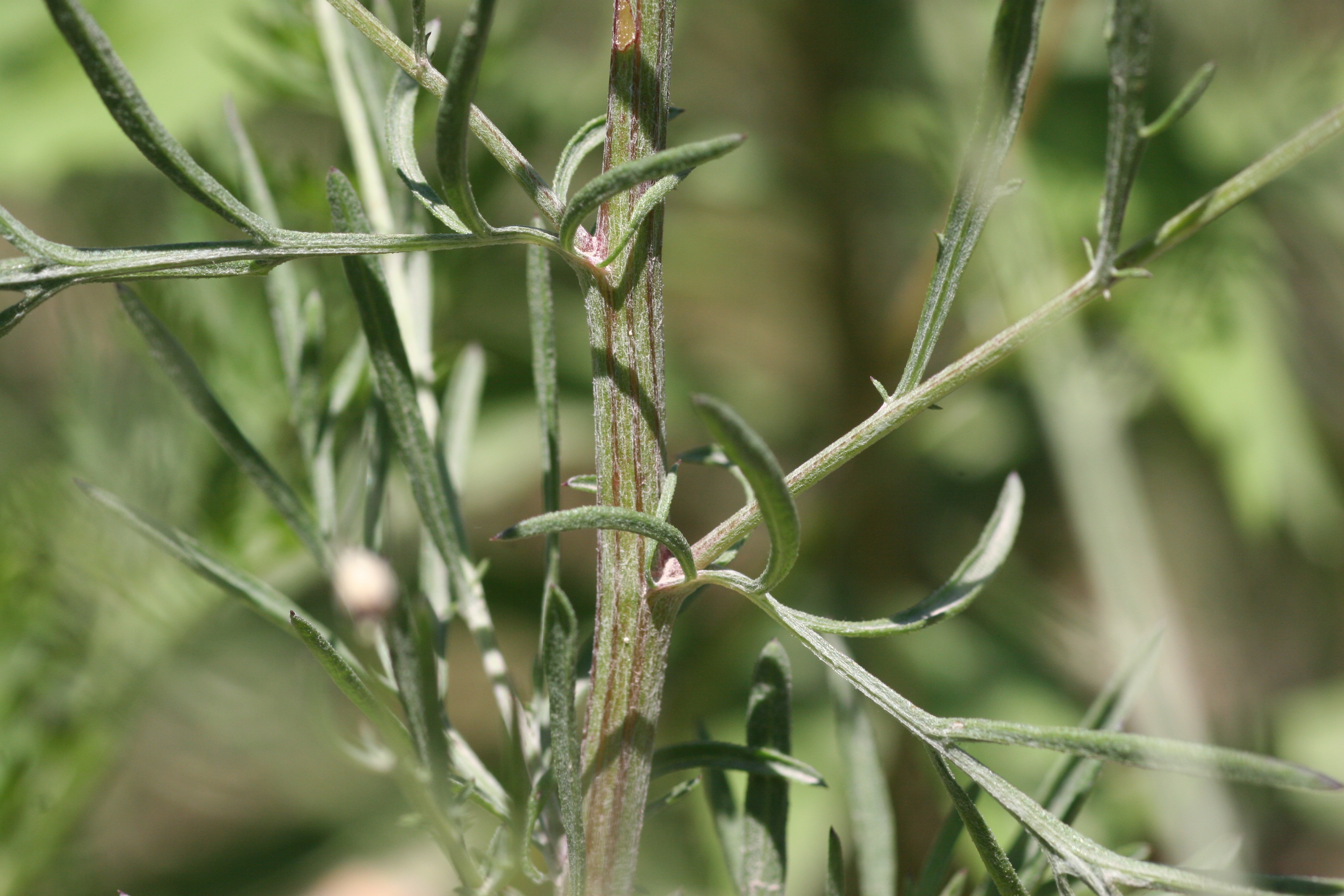 First-year leaves originate from a basal rosette,followed by a flowering stem in the second year. Basal leaves are deeply and irregularly lobed on long stalks; stem leaves are alternate and finely dissected. Leaves are grayish green and roughly hairy.