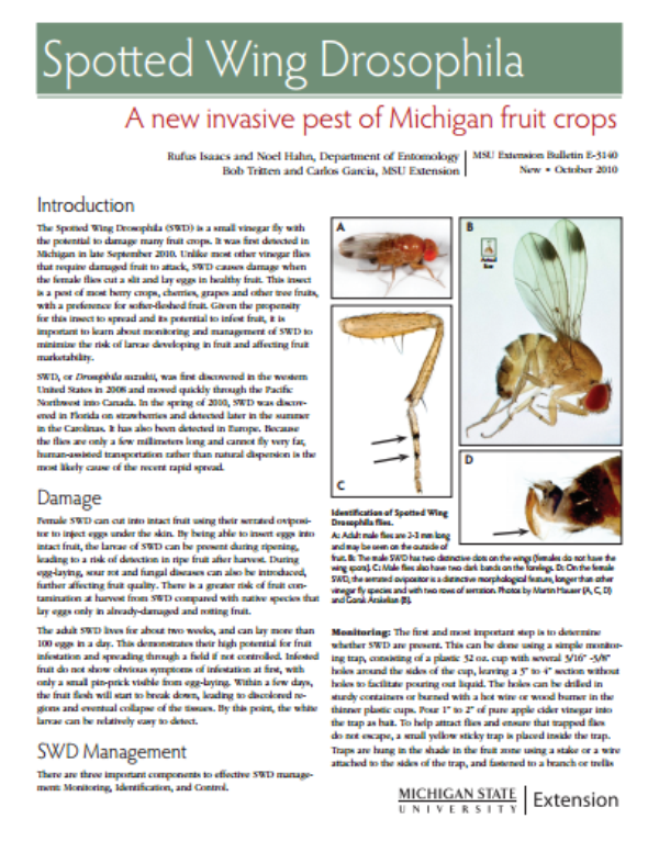 The Spotted Wing Drosophila (SWD) is a small vinegar fly with the potential to damage many fruit crops. It was first detected in Michigan in late September 2010. Unlike most other vinegar flies that require damaged fruit to attack, SWD causes damage when the female flies cut a slit and lay eggs in healthy fruit. This insect is a pest of most berry crops, cherries, grapes and other tree fruits, with a preference for softer-fleshed fruit. Given the propensity for this insect to spread and its potential to infest fruit, it is important to learn about monitoring and management of SWD to minimize the risk of larvae developing in fruit and affecting fruit marketability