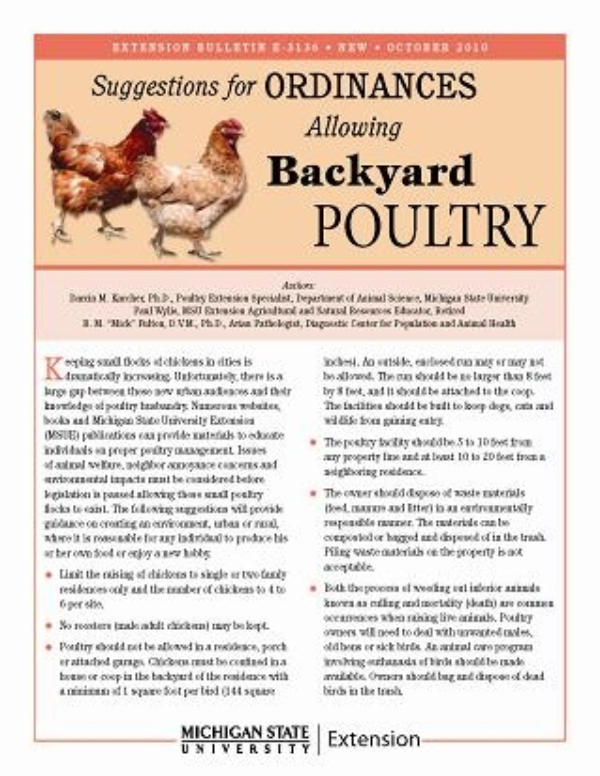 Keeping small flocks of chickens in cities is dramatically increasing. Unfortunately, there is a large gap between these new urban audiences and their knowledge of poultry husbandry. Numerous websites, books and Michigan State University Extension (MSUE) publications can provide materials to educate individuals on proper poultry management. Issues of animal welfare, neighbor annoyance concerns and environmental impacts must be considered before legislation is passed allowing these small poultry flocks to exist. The following suggestions will provide guidance on creating an environment, urban or rural, where it is reasonable for any individual to produce his or her own food or enjoy a new hobby.