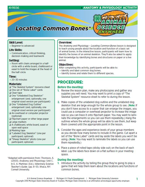 The Anatomy and Physiology – Locating Common Bones lesson is designed to teach young people about the location and function of a basic set of animal bones. In the interactive lesson, participants will learn how to identify the bones of an animal skeleton. They’ll also be asked to apply their knowledge by identifying bones and structures on paper or a live animal.