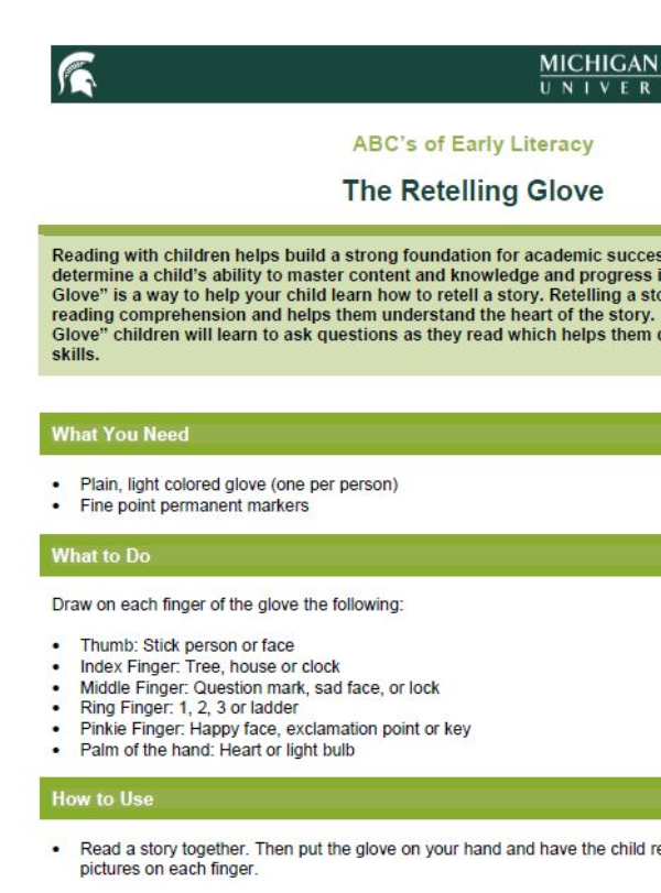 Reading with children helps build a strong foundation for academic success. Reading skills help determine a child’s ability to master content and knowledge and progress in school. The “Retelling Glove” is a way to help your child learn how to retell a story. Retelling a story helps children practice reading comprehension and helps them understand the heart of the story. By using the “Retelling Glove” children will learn to ask questions as they read which helps them develop critical thinking skills.