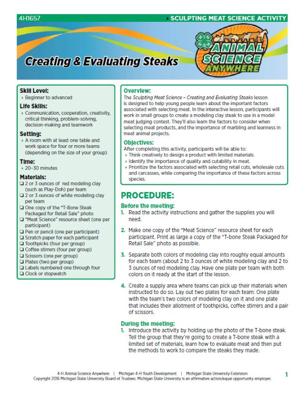 The Sculpting Meat Science – Creating and Evaluating Steaks lesson is designed to help young people learn about the important factors associated with selecting meat. In the interactive lesson, participants will work in small groups to create a modeling clay steak to use in a model meat judging contest. They’ll also learn the factors to consider when selecting meat products, and the importance of marbling and leanness in meat animal projects.