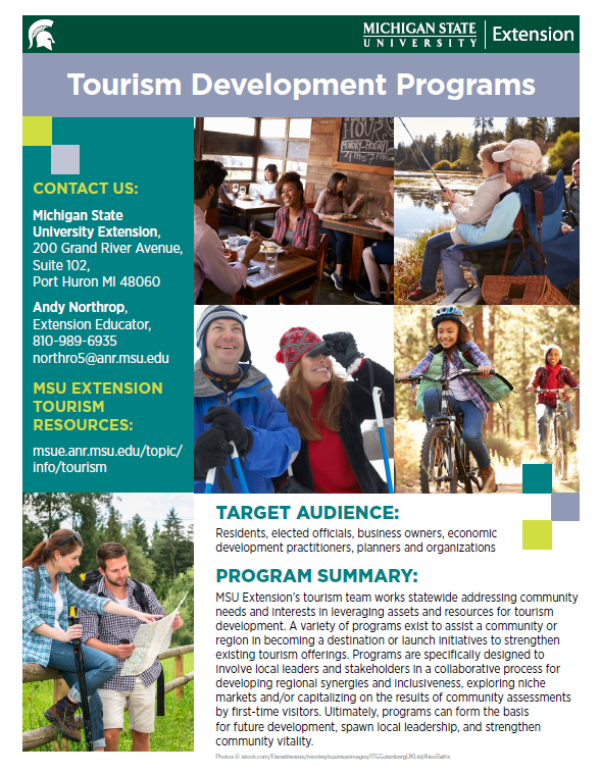 MSU Extension’s tourism team works statewide addressing community needs and interests in leveraging assets and resources for tourism development. A variety of programs exist to assist a community or region in becoming a destination or launch initiatives to strengthen existing tourism offerings. Programs are specifically designed to involve local leaders and stakeholders in a collaborative process for developing regional synergies and inclusiveness, exploring niche markets and/or capitalizing on the results of community assessments by first-time visitors. Ultimately, programs can form the basis for future development, spawn local leadership, and strengthen community vitality.