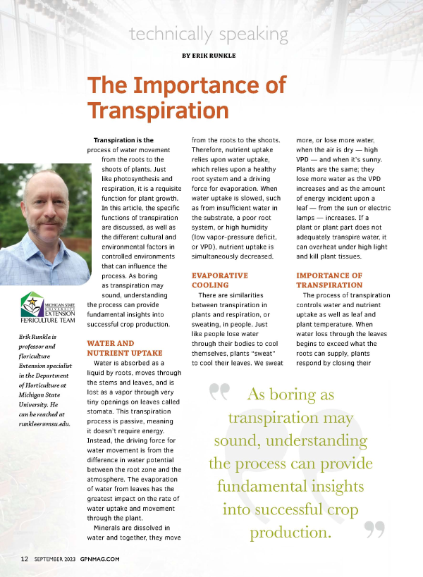 Transpiration is the process of water movement from the roots to the shoots of plants. As boring as it may sound, understanding the process can provide valuable insights into successful crop production.